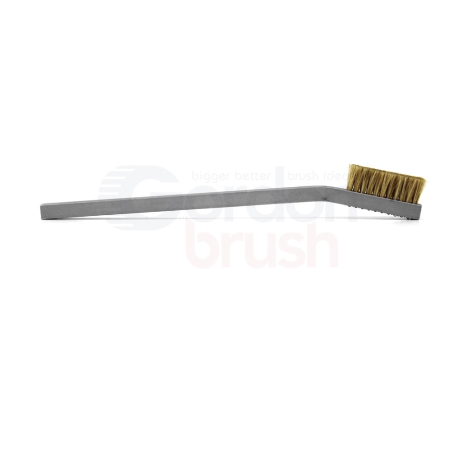 This brush has anti-static horse hair bristle with a hand-laced aluminum handle. The horse hair fill material is hand-laced with stainless steel wire into its handle for maximum fiber retention. This high-quality brush has a 2 x 11 row configuration, with a 7/16" trim, and a brush face of 1-1/4" x 1/4". These brushes are popular for detail cleaning on items such as printed circuit boards and SMT assemblies, or for use as fluid applicators. For a larger horse hair brush see part # 33HHA.